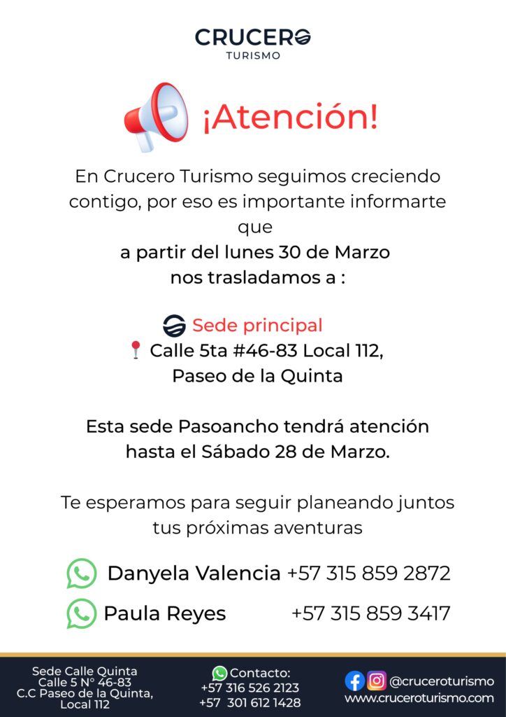 - Dos oficinas en Cali para apoyarte en lo que necesites en torno a tus viajes.